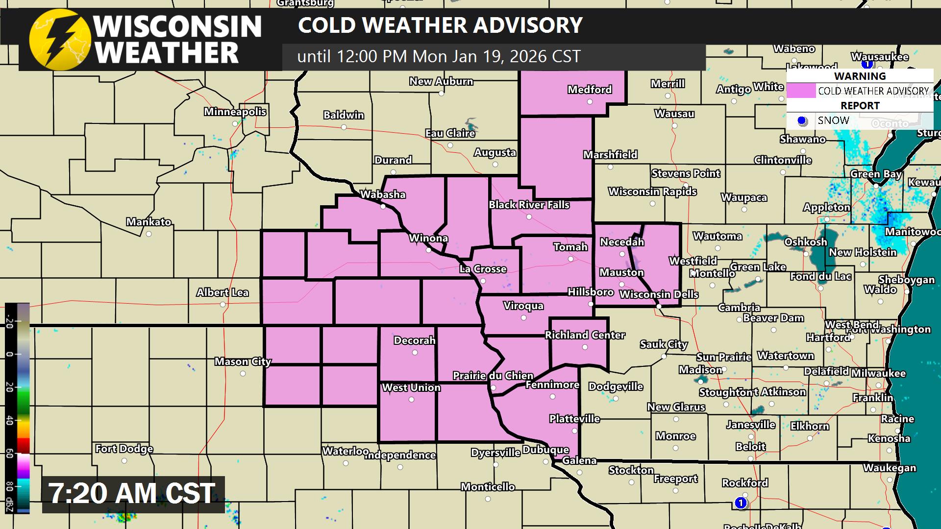Cold Weather Advisory issued January 19 at 7:20AM CST until January 19 at 12:00PM CST by NWS La Crosse WI